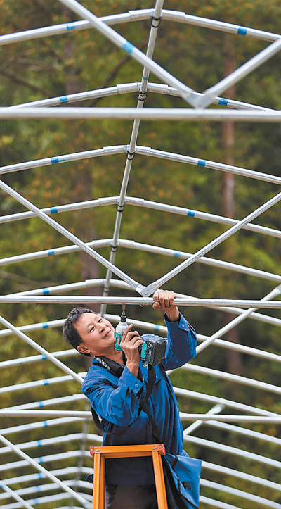 4月1日,工人在重庆市黔江区李家溪易地扶贫搬迁安置点食用菌产业园搭建食用菌栽培大棚钢架。 杨 敏摄(人民视觉) |