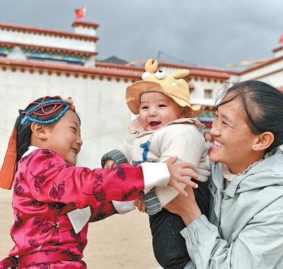 4月1日,西藏拉萨市古荣乡荣玛高海拔生态搬迁点,石珍(右)一家在家门口玩耍。 新华社记者 詹 彦摄 |