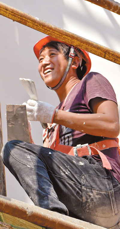 3月25日,四川凉山州金阳县马依足乡易地扶贫搬迁“千户彝寨”安置点内,工人在粉刷房屋外墙。 王永战 贾巴尔且摄影报道 |